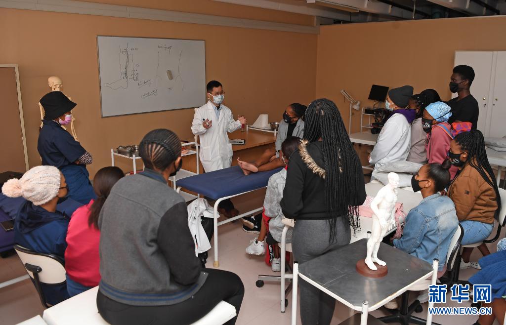 6月9日,针灸课老师胡紫景在南非约翰内斯堡大学给同学们讲解针灸相关知识。
