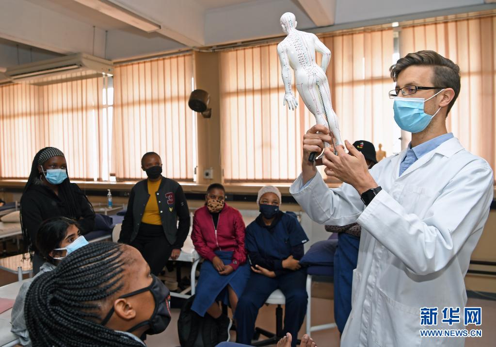 6月9日,针灸课助理教师达伦在南非约翰内斯堡大学给同学们讲解人体穴位知识。