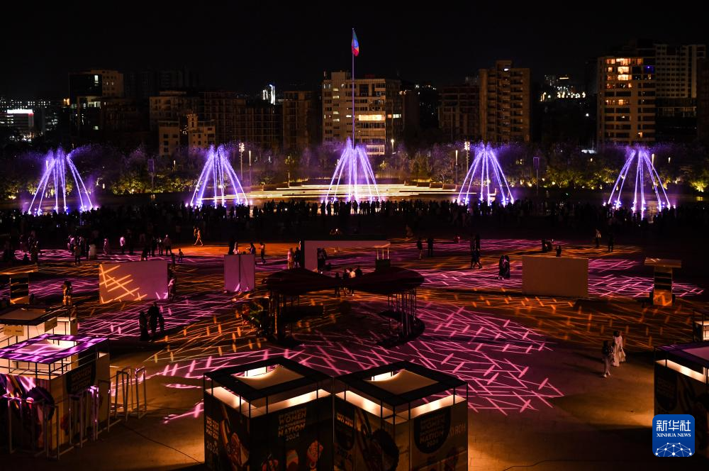 这是2月18日在埃塞俄比亚首都亚的斯亚贝巴友谊广场拍摄的音乐喷泉和光影秀。