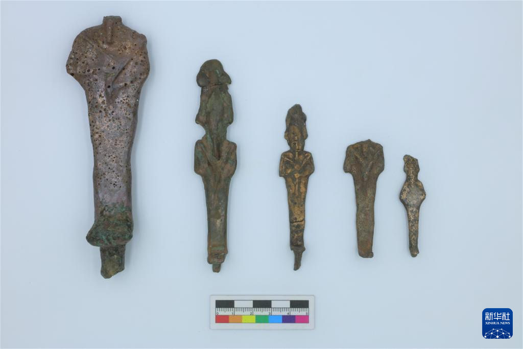这是在埃及卢克索拍摄的中埃卢克索孟图神庙联合考古项目发掘出土的不同尺寸的奥西里斯神铜像(2020年3月28日摄)。