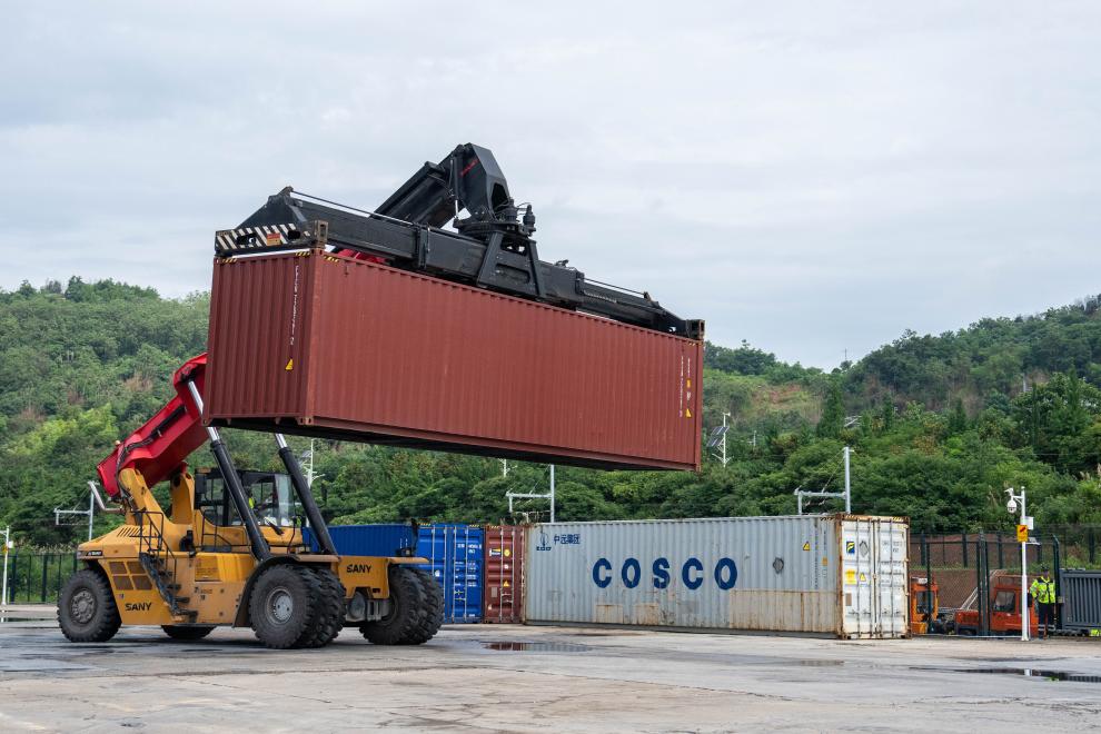6月20日,在株洲中车物流园,工作人员在进行集装箱装车作业。新华社记者陈思汗摄