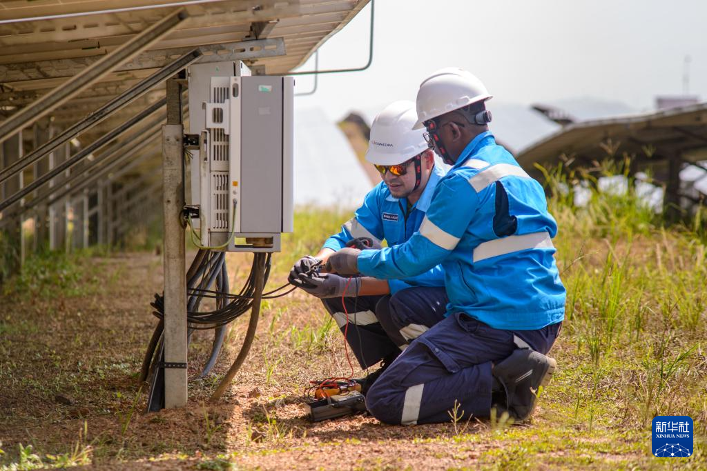 在马来西亚吉打州南部的瓜拉基蒂光伏电站,工人检查设备(6月6日摄)。这座电站由中国广核能源国际控股有限公司所属埃德拉电力控股有限公司运营,由中国能源建设集团天津电力建设有限公司承建,占地260英亩,装机50兆瓦,2019年开始商业运行。