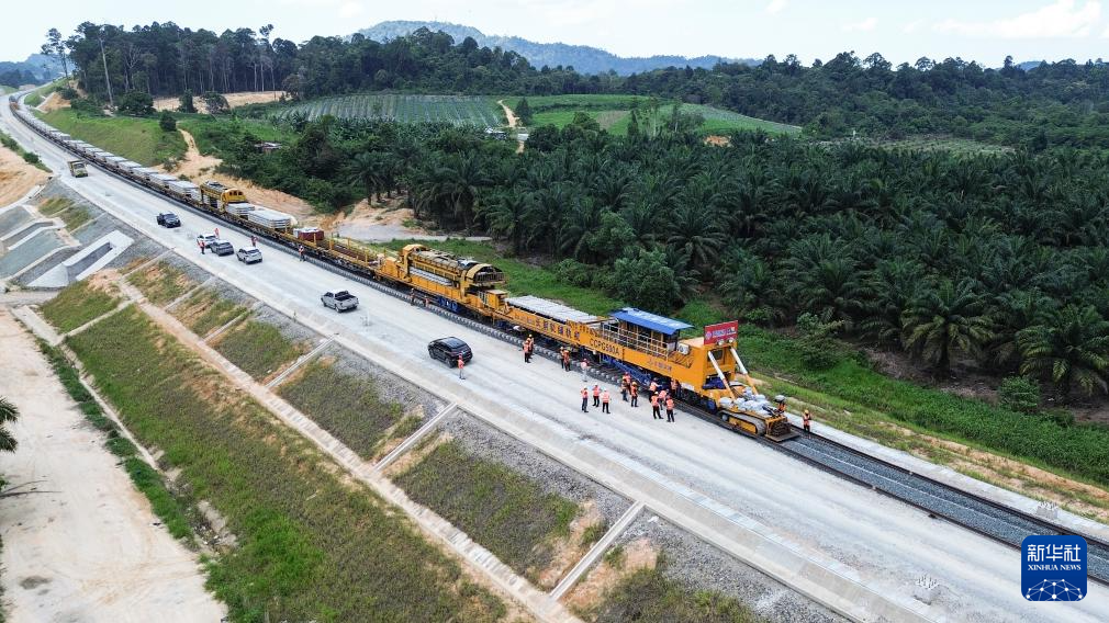 这是5月6日在马来西亚彭亨州航拍的马东铁项目的铺轨现场。
