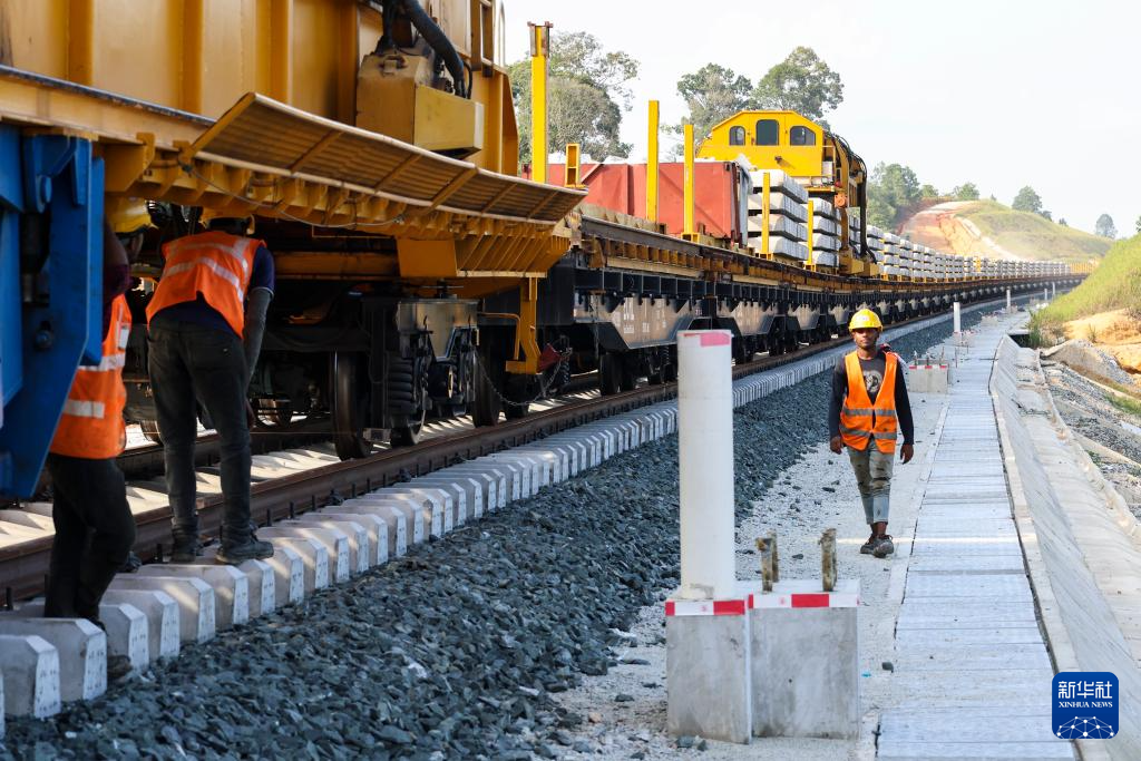 5月6日,在马来西亚彭亨州,马东铁项目的工人正在进行铺轨工作。