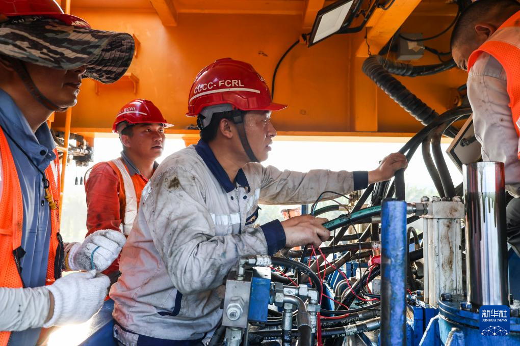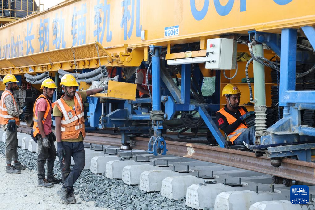 5月6日,在马来西亚彭亨州马东铁项目的铺轨现场,工人们检查铺轨机。