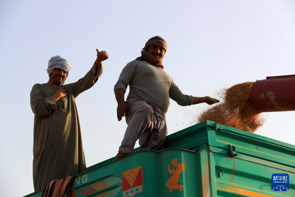 5月3日,收割机在埃及新河谷省的一处农场将收获的小麦装车。该农场的灌溉用水来自中曼埃及公司在当地打的水井。