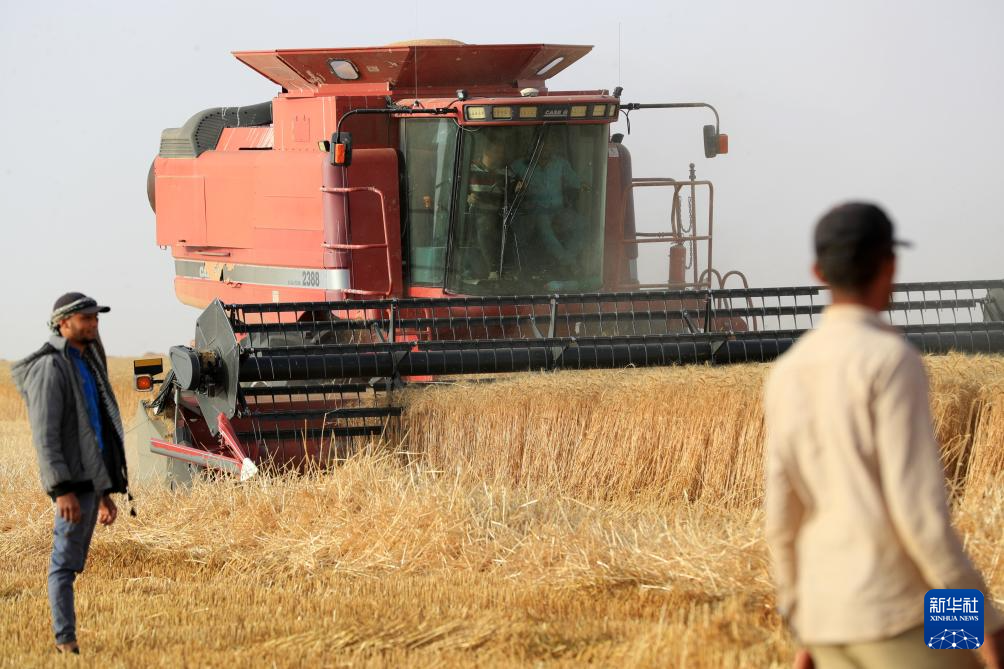 5月3日,收割机在埃及新河谷省的一处农场收获小麦。该农场的灌溉用水来自中曼埃及公司在当地打的水井。