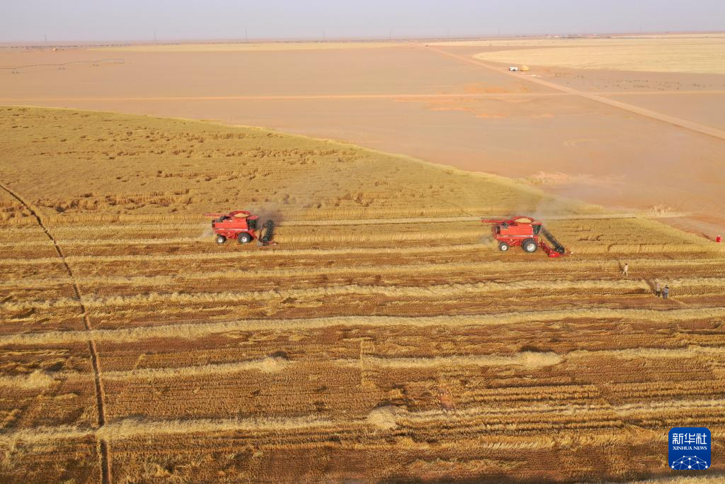距离埃及首都开罗1300多公里的南部荒漠暖阳高照,无垠的沙海中涌动着金色的麦浪。伴随着收割机的轰鸣,今年第一茬小麦喜获丰收。
