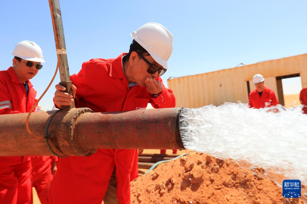 5月3日,在埃及新河谷省的奥瓦伊纳特水井项目现场,中曼集团董事长李春第品尝水井喷出的地下水。