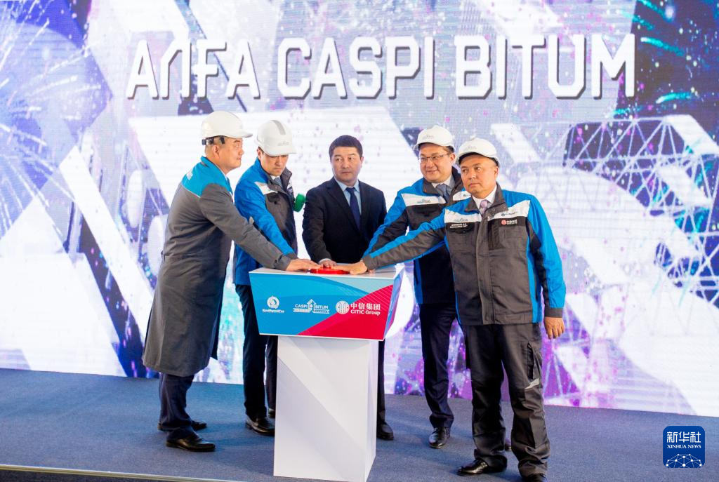 5月5日,嘉宾出席在哈萨克斯坦阿克套举行的里海沥青厂扩能升级改造项目投产仪式。