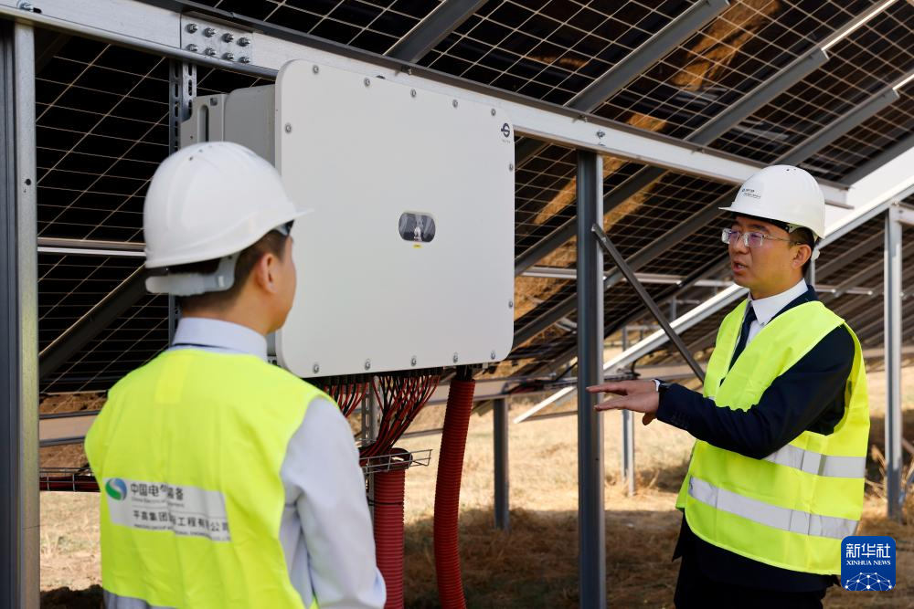 8月12日,在罗马尼亚东南部克勒拉希县的斯特凡大公村,中国平高集团国际工程有限公司总经理朱继斌(右)在31.8兆瓦光伏电站项目现场与工作人员交流。