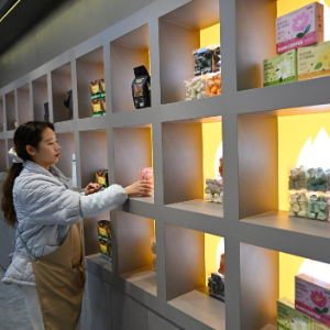 1月27日,在河南濮阳县的中国(濮阳)埃塞咖啡产业示范园咖啡展销区,工作人员在整理产品。