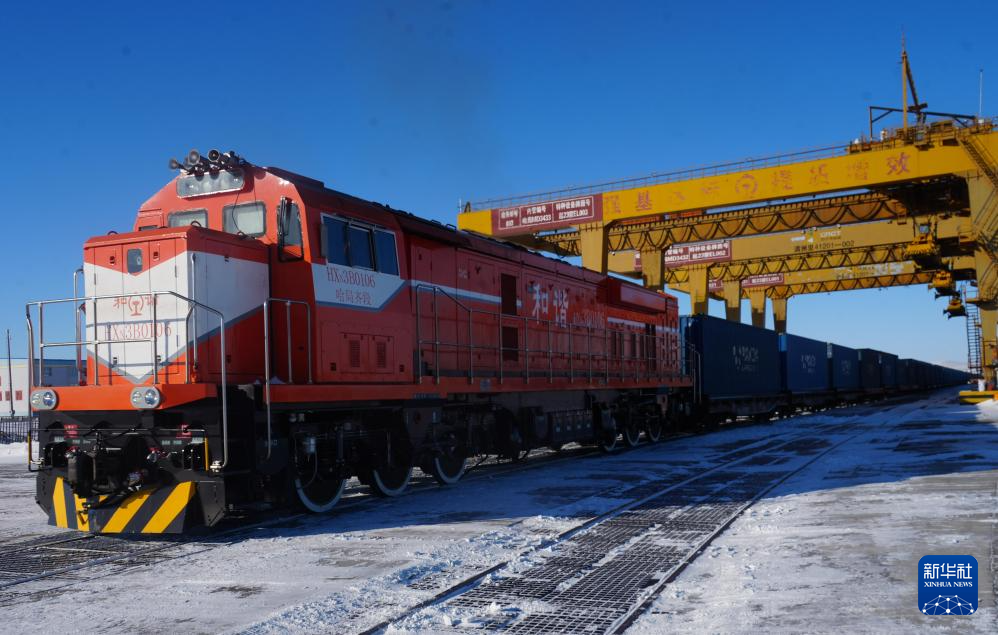 2月26日,中欧班列在中国铁路哈尔滨局集团有限公司满洲里站等待出境发车(无人机照片)。