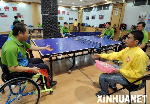 3月14日,志愿者(前右)在北京市朝阳区残疾人综合活动中心为肢体残疾的乒乓球运动员服务。当日,北京市朝阳区残疾人综合活动中心正式成为2008年残奥会志愿者培训基地。这是由北京奥运会培训工作协调小组等相关部门认定资质的第29个残奥会志愿者培训基地。预计2008年残奥会举办前,北京将在全市建立30个以实践活动为主、引导志愿者开展学习培训的残奥会志愿者培训基地。