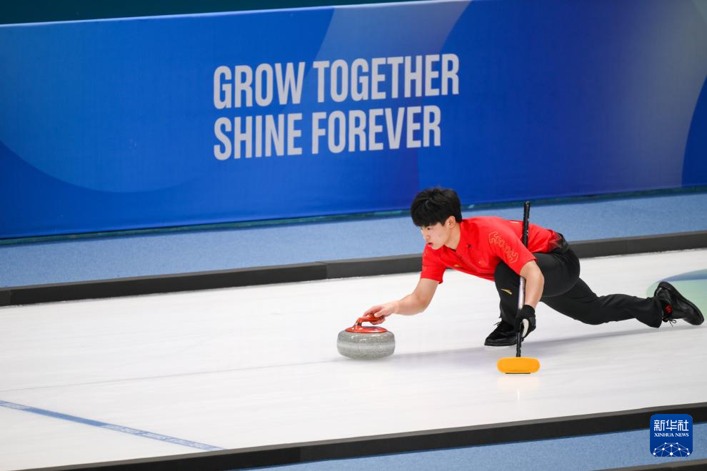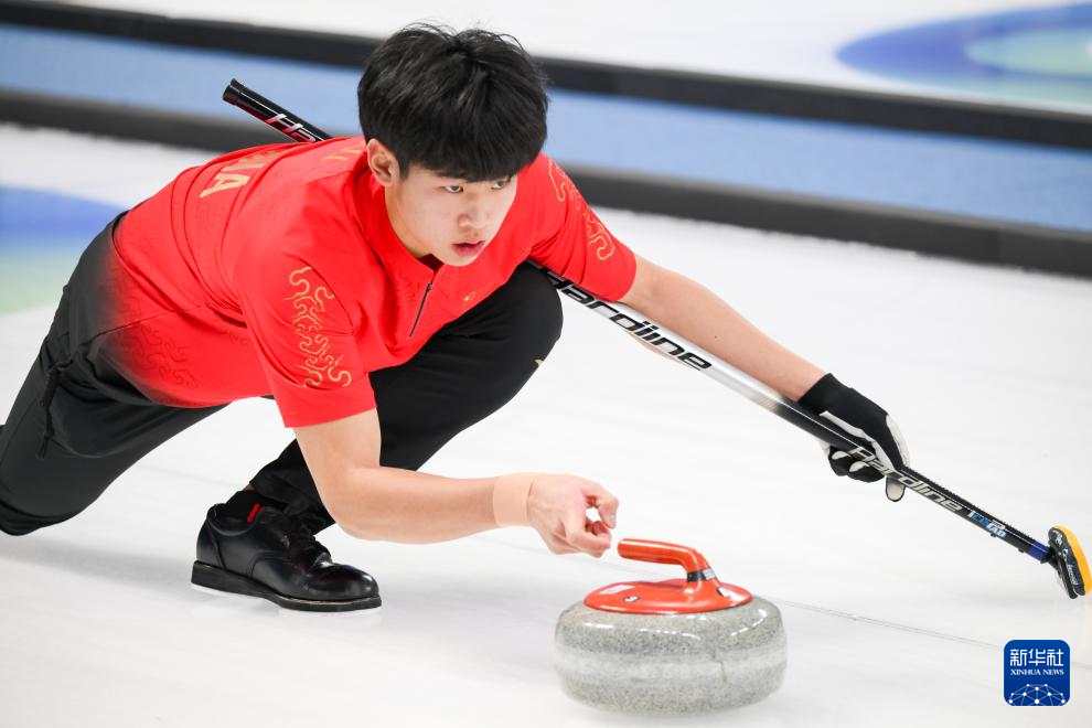 1月31日,中国选手许博康在比赛中掷冰壶。新华社记者 朱炜 摄
