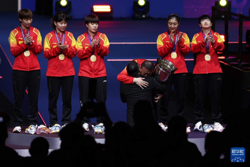 2月24日,国际乒联第一副主席刘国梁(右四)与中国队教练马琳(右三)在颁奖仪式上拥抱。