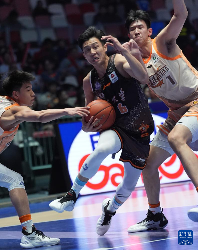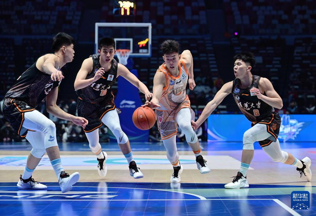 3月2日,星锐一年级队球员段昂君(右二)带球突破清华大学队球员的包夹防守。新华社记者 魏培全 摄