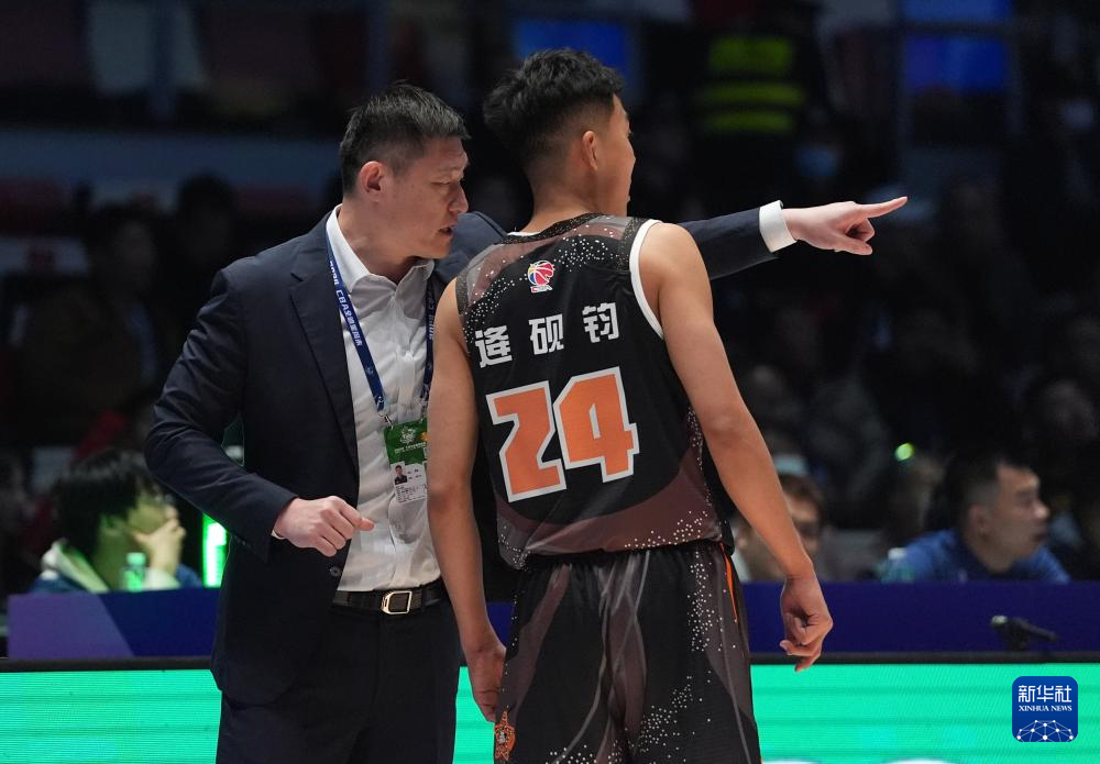 3月2日,清华大学队主教练陈磊(左)在比赛中指导球员逄砚钧。新华社记者 孟永民 摄