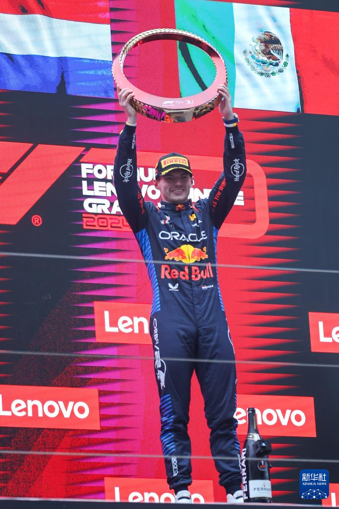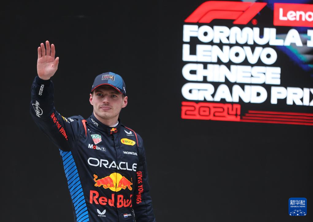 4月21日,冠军红牛车队荷兰车手维斯塔潘在颁奖仪式上。新华社记者 王翔 摄