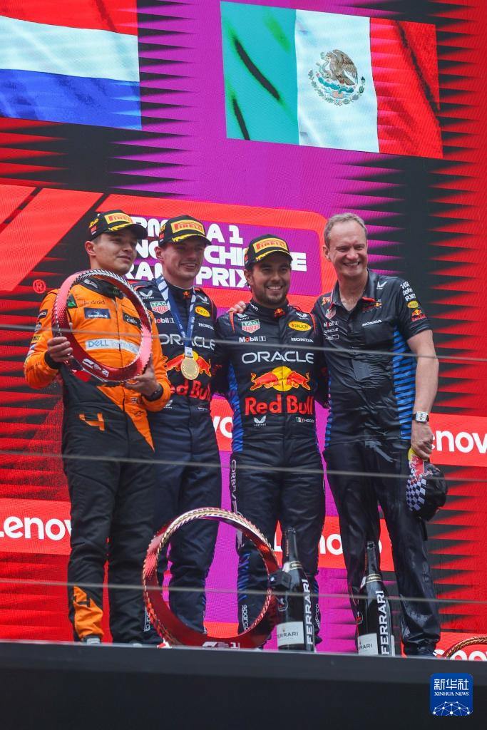 4月21日,维斯塔潘(左二)、诺里斯(左一)和佩雷兹(右二)在颁奖仪式上合影。新华社记者 王翔 摄
