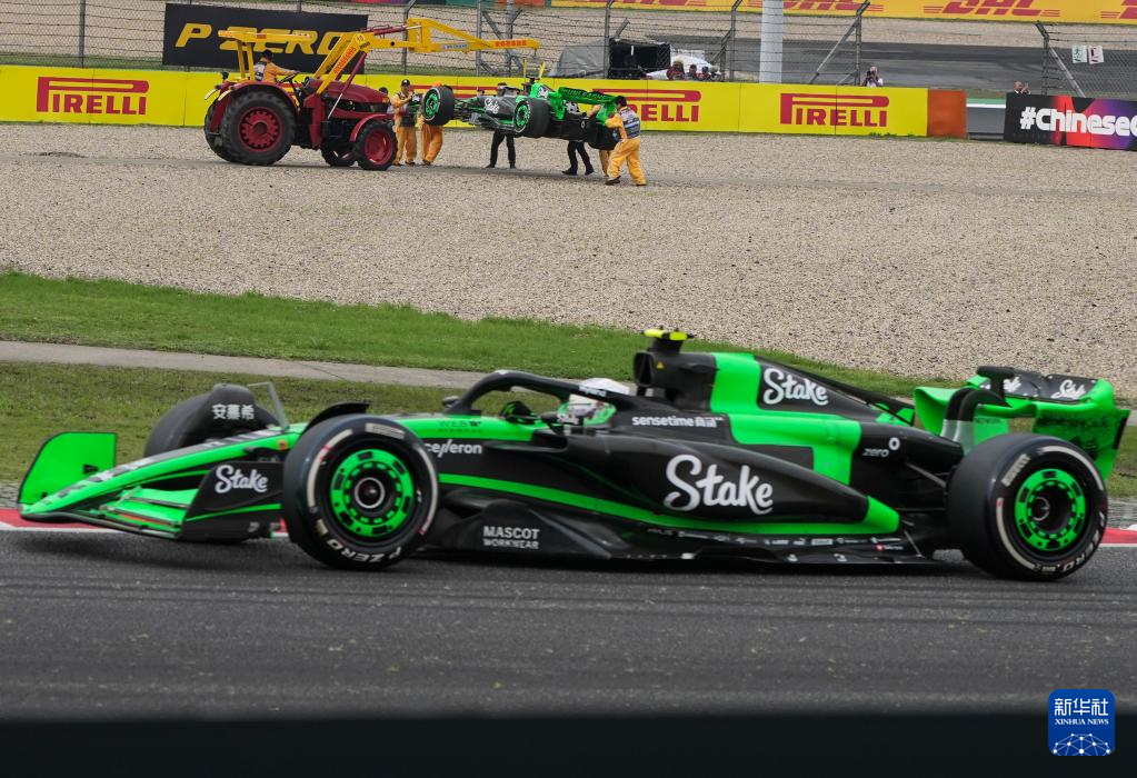4月21日,索伯车队车手博塔斯的赛车因引擎问题被吊离赛道(上)。新华社记者 贺长山 摄