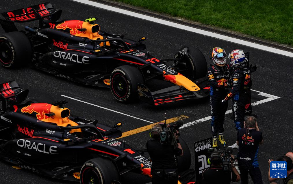 4月21日,红牛车队荷兰车手维斯塔潘(上右)与队友佩雷兹在赛后庆祝。新华社记者 夏一方 摄