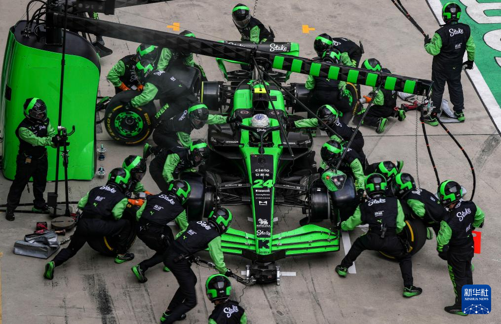 4月21日,索伯车队工作人员为中国车手周冠宇的赛车更换轮胎。新华社记者 夏一方 摄