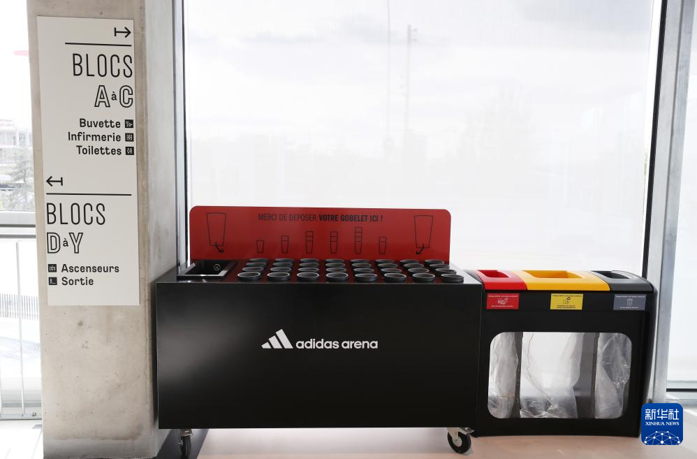 这是4月23日在法国巴黎拉夏贝尔门体育馆内拍摄的垃圾桶和环保杯收纳处。新华社记者 高静 摄