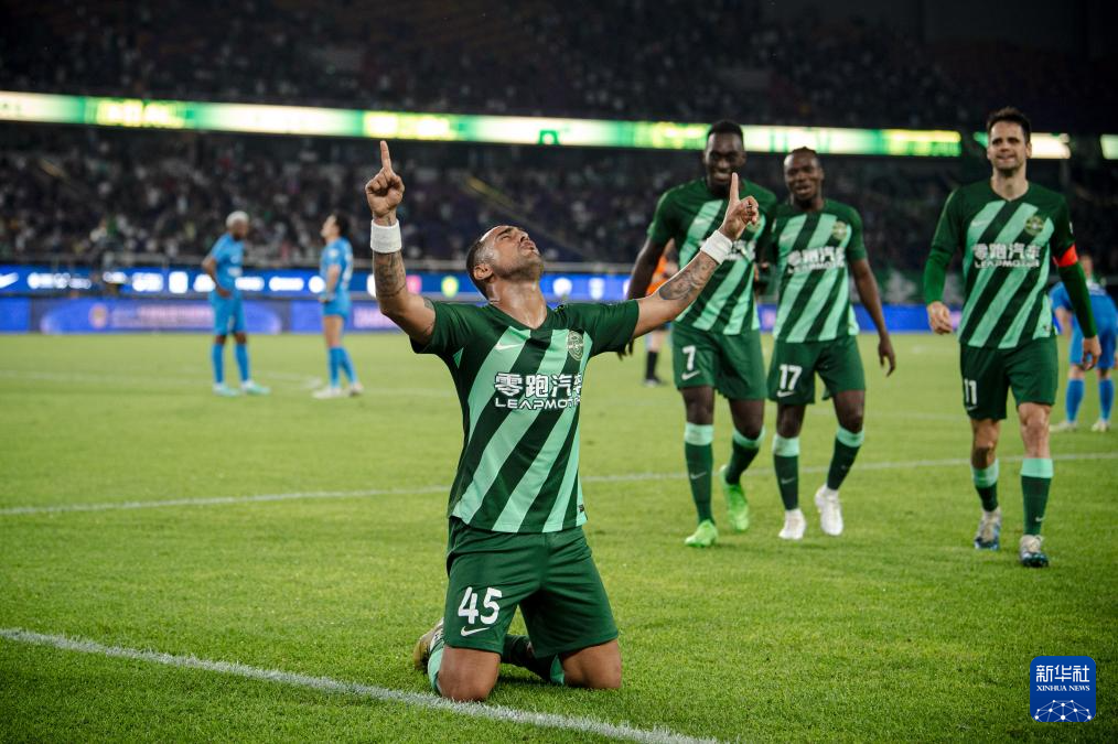5月17日,浙江队球员莱昂纳多(前)进球后庆祝。当日,在2024赛季中国足球协会超级联赛第12轮比赛中,浙江队主场5比2战胜南通支云队。新华社记者 江汉 摄