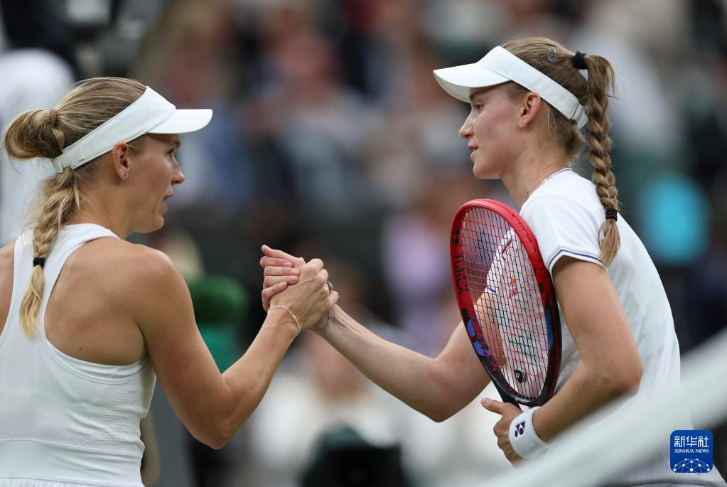 7月6日,莱巴金娜(右)与沃兹尼亚奇在比赛后握手致意。新华社记者 韩岩 摄