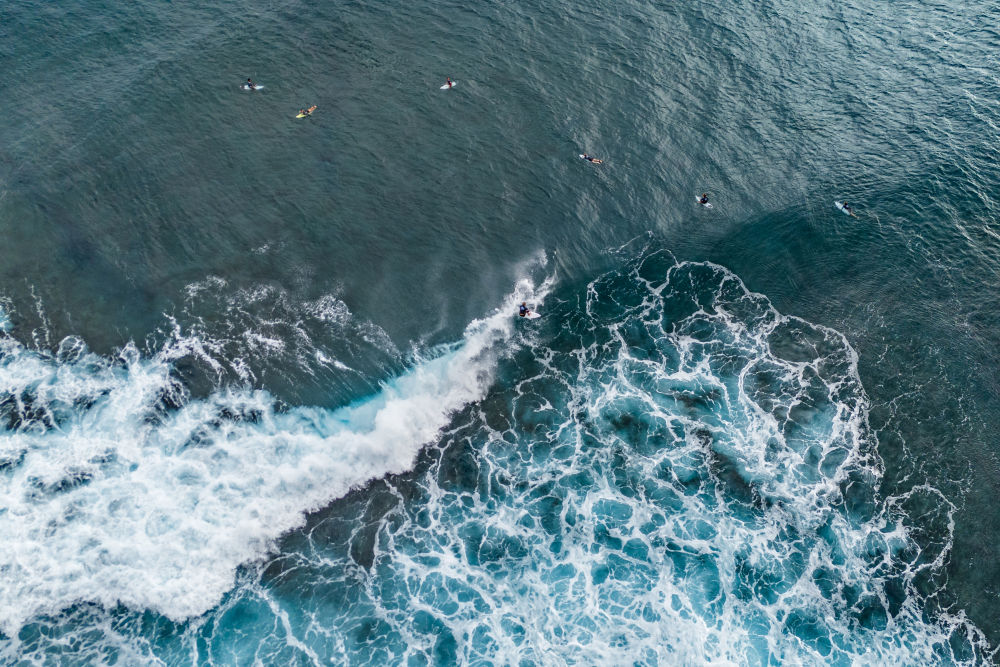 7月21日,选手们在赛前训练中(无人机照片)。当日,冲浪选手在法属波利尼西亚群岛的塔希提进行训练。巴黎奥运会冲浪项目将于7月27日迎来首个比赛日。新华社发(Pool照片/马尼亚·法比施)