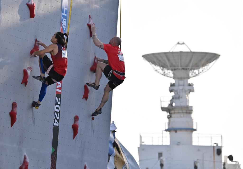 5月18日,中国选手王欣尚(左)与西班牙选手卡多纳在巴黎奥运会资格系列赛上海站男子攀岩速度赛中。新华社记者 陶希夷 摄