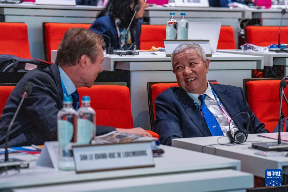 7月23日,国际奥委会委员、中国奥委会副主席于再清(右)在会议开始前。新华社记者 孙非 摄