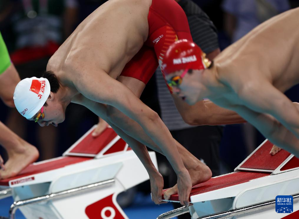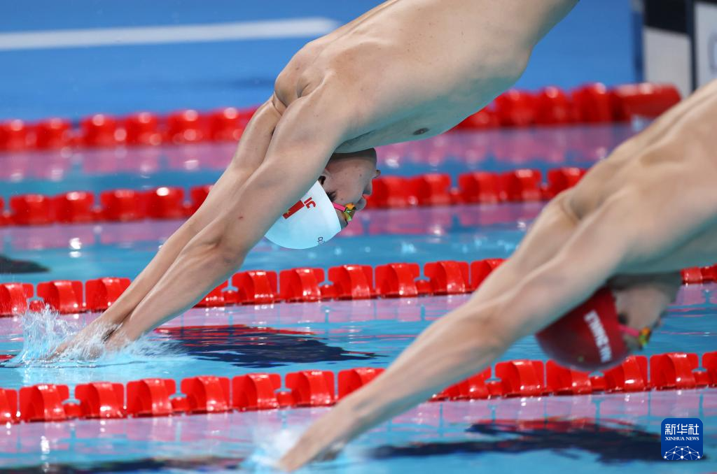 7月28日,中国选手季新杰(左)和潘展乐在男子200米自由泳预赛中入水,他们均无缘半决赛。新华社记者 雒圆 摄
