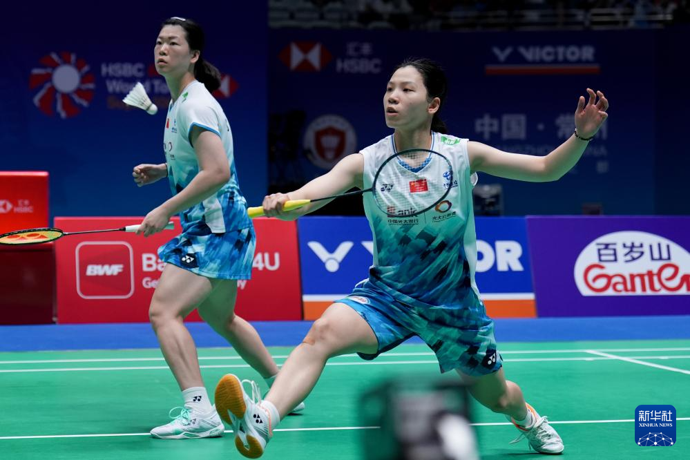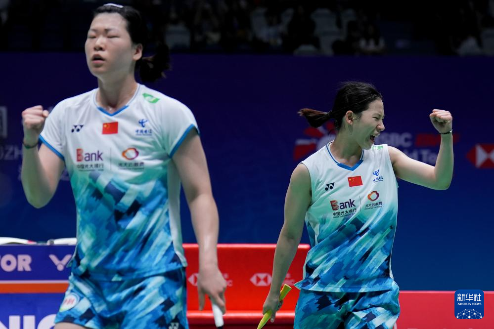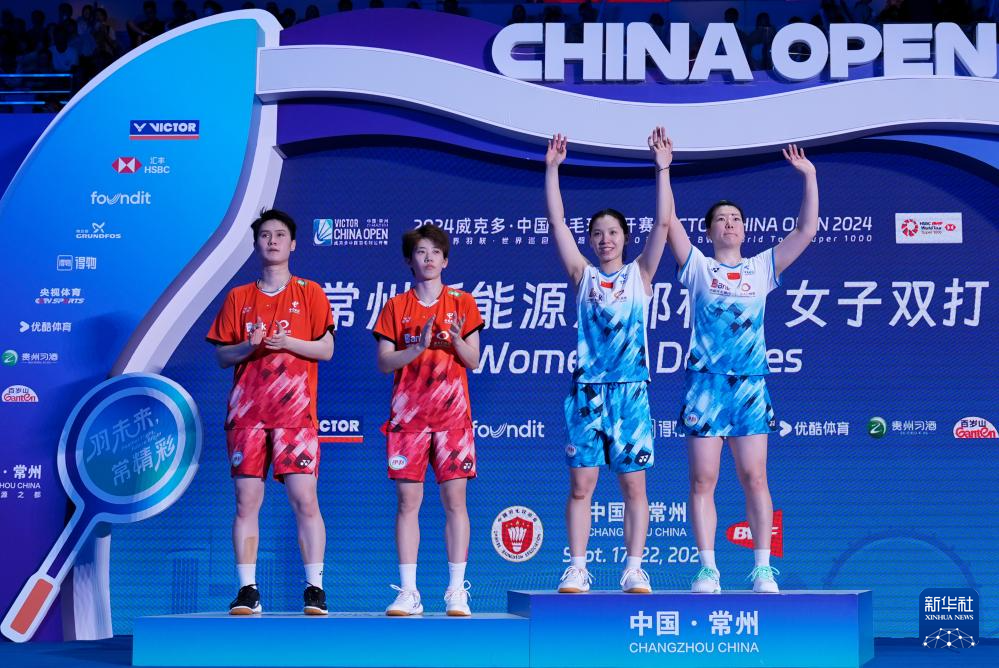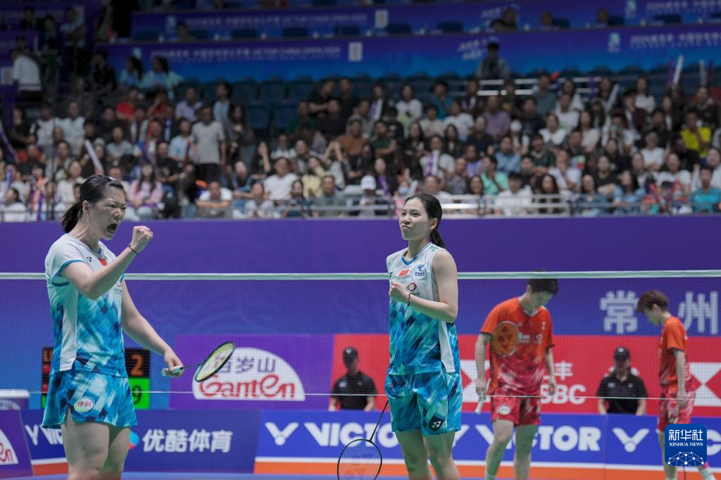 当日,在江苏省常州市举行的2024中国羽毛球公开赛女子双打决赛中,中国组合李怡婧/罗徐敏2比1战胜队友李汶妹/张殊贤,获得冠军。