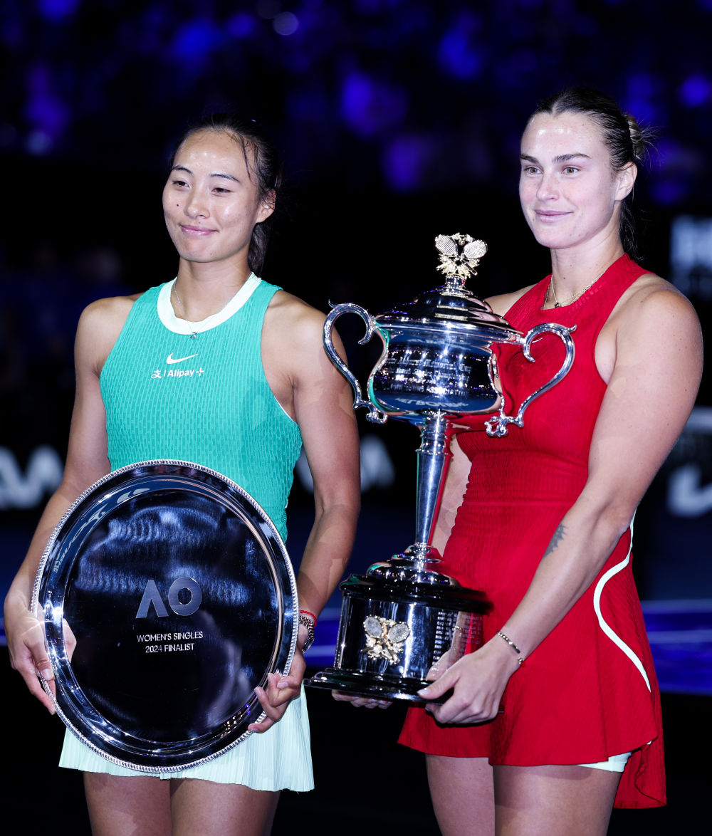 1月27日,亚军郑钦文(左)与冠军萨巴伦卡在澳网女单颁奖典礼上合影。新华社记者 马平 摄