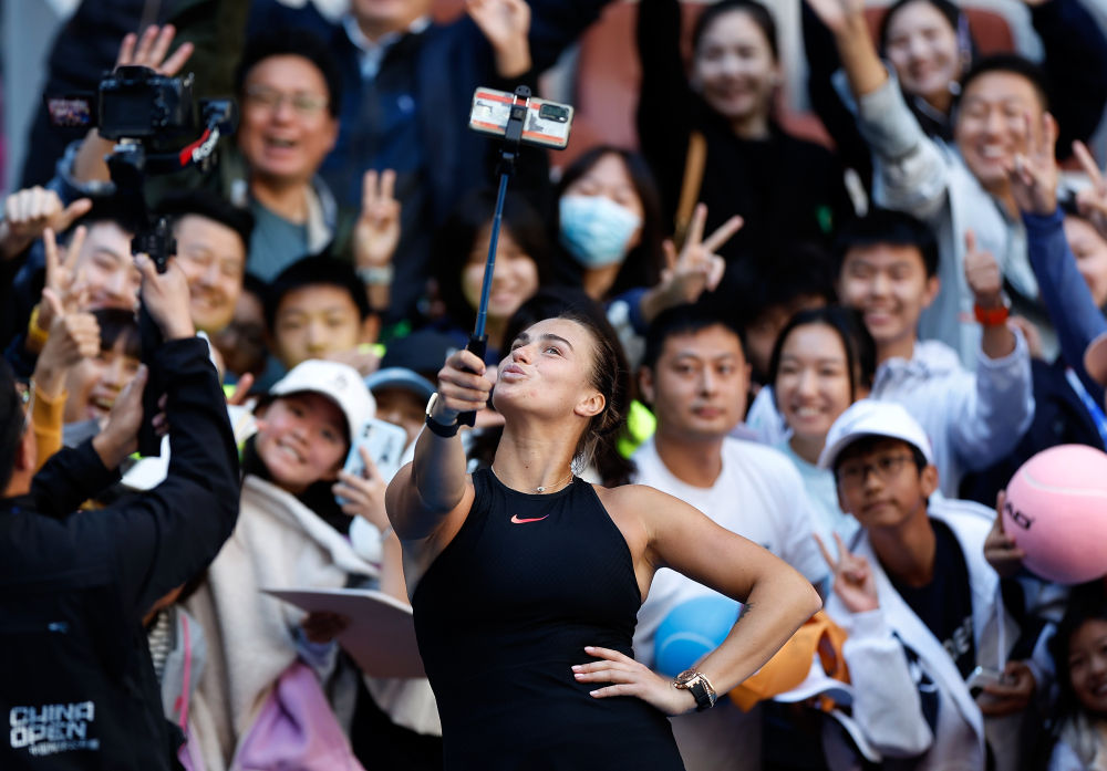 10月2日,萨巴伦卡在中网女单第四轮比赛获胜后与观众自拍。新华社记者 王丽莉 摄