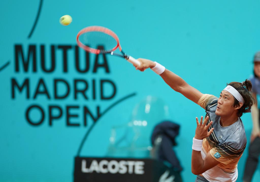 2023年5月1日,张之臻在比赛中发球。当日,在2023年马德里网球公开赛男子单打第三轮比赛中,中国选手张之臻以2:1战胜英国选手诺里,晋级十六强。新华社记者 孟鼎博 摄