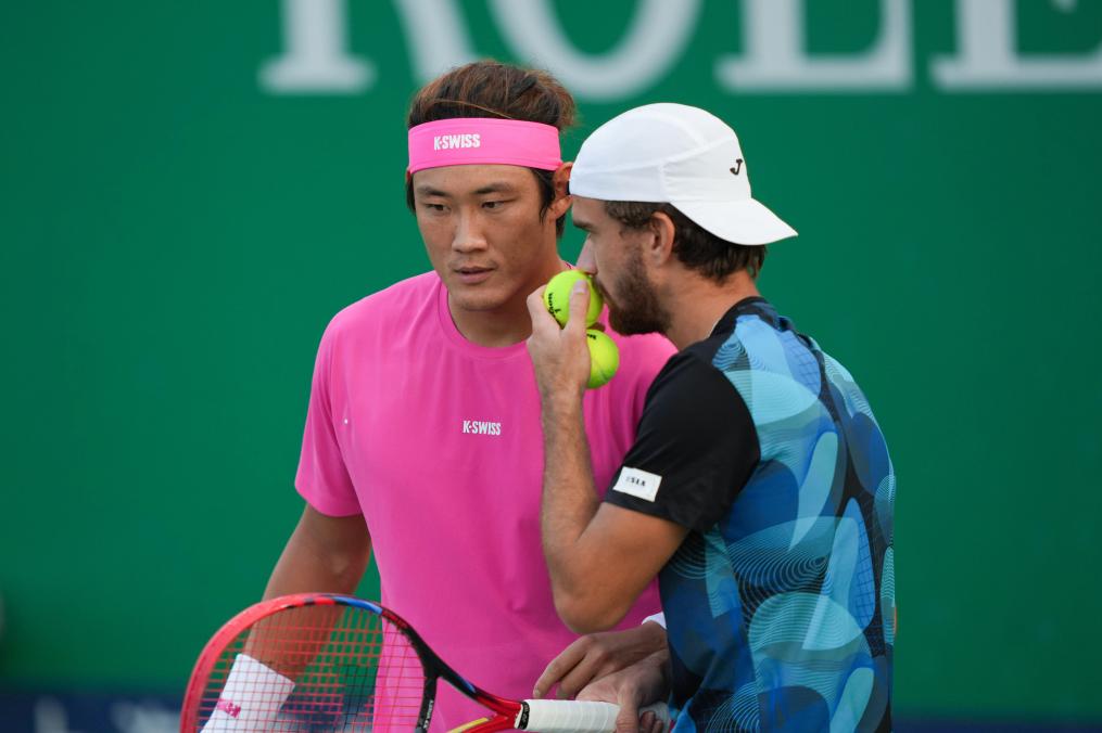 10月8日,张之臻(左)/马哈奇在2024年ATP上海网球大师赛男双首轮比赛中交流。新华社记者 许雅楠 摄