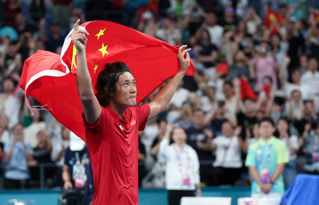 2023年9月30日,张之臻在杭州亚运会网球项目男子单打决赛后庆祝夺冠。新华社记者 孟晨光 摄