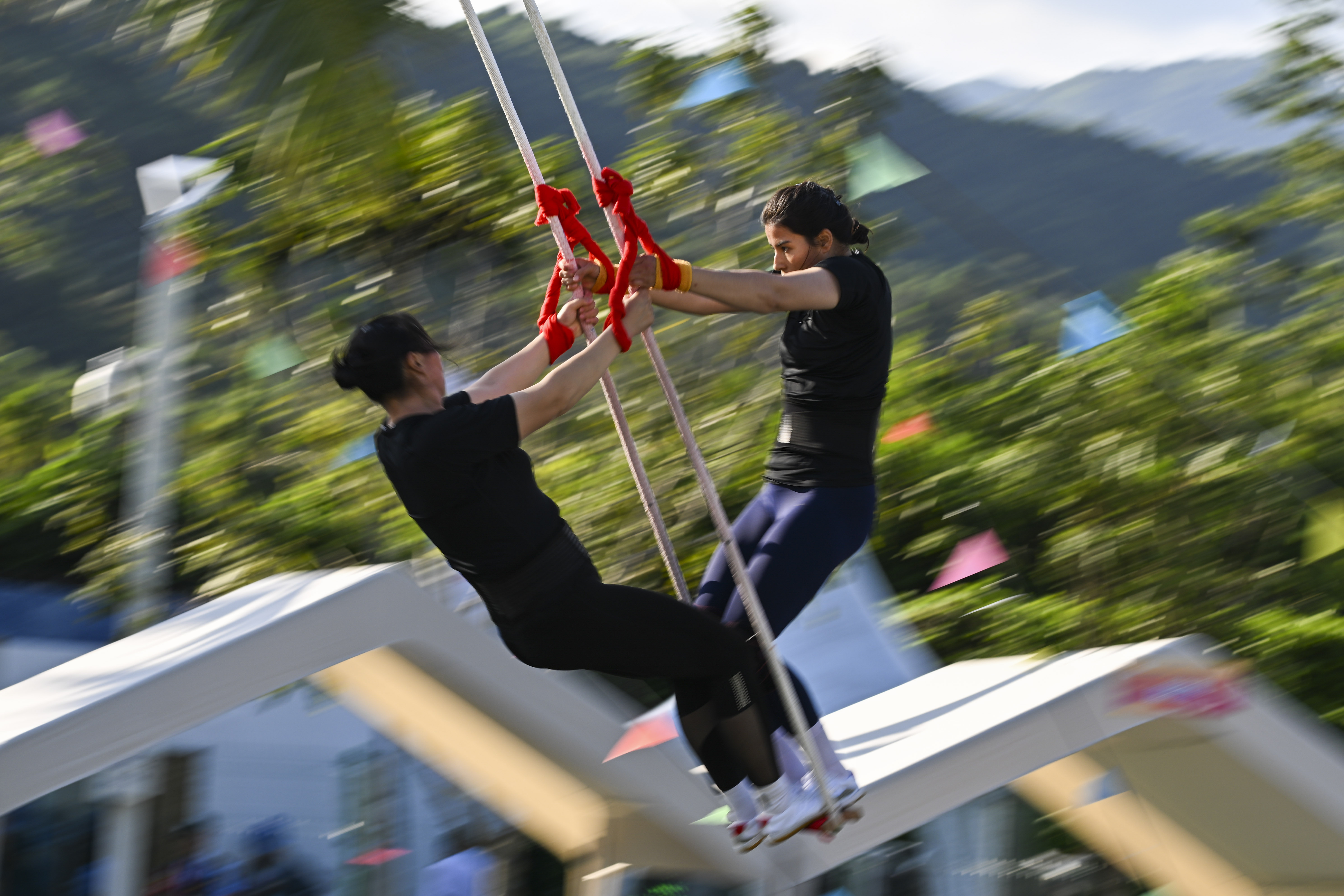 11月23日,新疆生产建设兵团队组合努尔巴合·加拿提马依拉·阿布都瓦依提(左)在比赛中。最终,她们获得二等奖。新华社记者 曹祎铭 摄