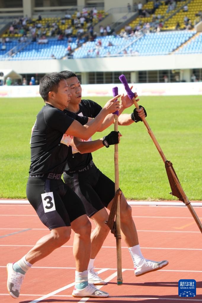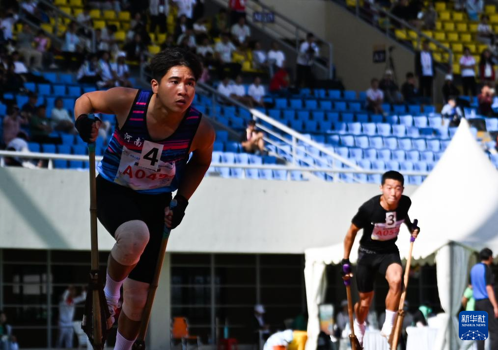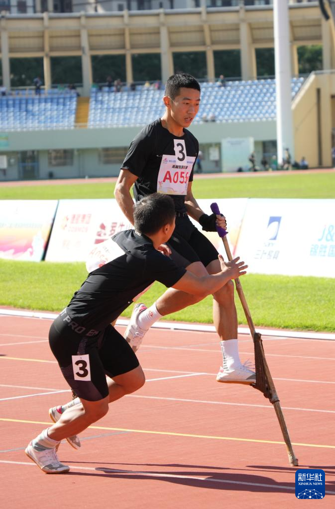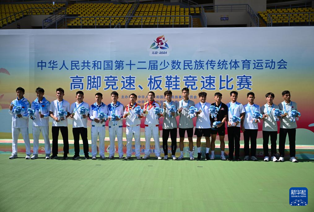 当日,第十二届全国少数民族传统体育运动会高脚竞速男子2X200米接力决赛在海南省三亚市举行。
