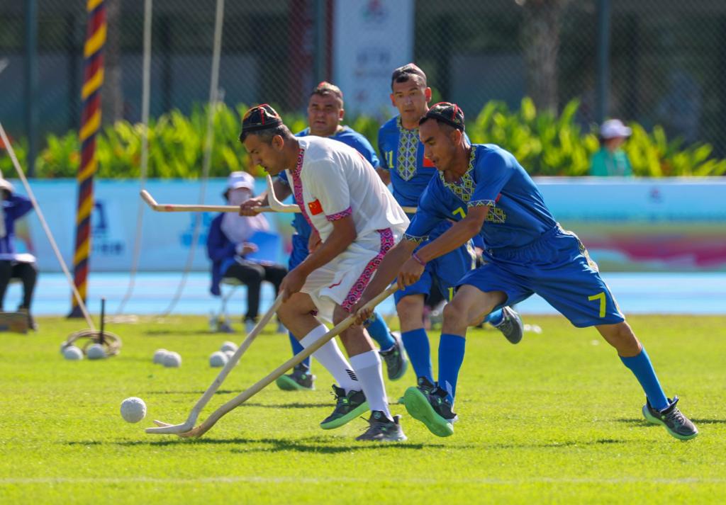 11月24日,在三亚市体育中心举行的第十二届全国少数民族传统体育运动会室外表演项目中,新疆队球员阿卜杜拉艾孜则·阿卜杜海娃尔(前右)在麦热球表演中。新华社记者 陈朔 摄