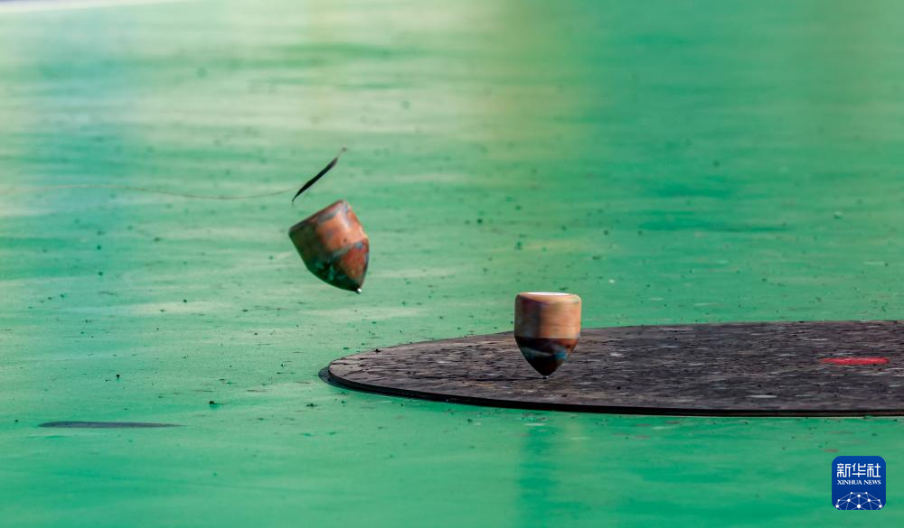 11月29日,上海队选手李秀平的陀螺(左)在比赛中进攻击打重庆队选手李进文的陀螺。
