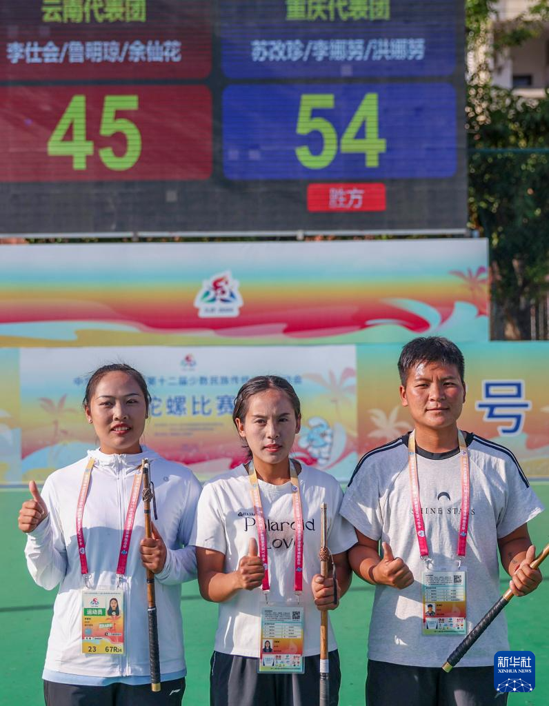 当日,在海南三亚举行的第十二届全国少数民族传统体育运动会陀螺女子团体决赛中,重庆队54比45战胜云南队,获得一等奖。