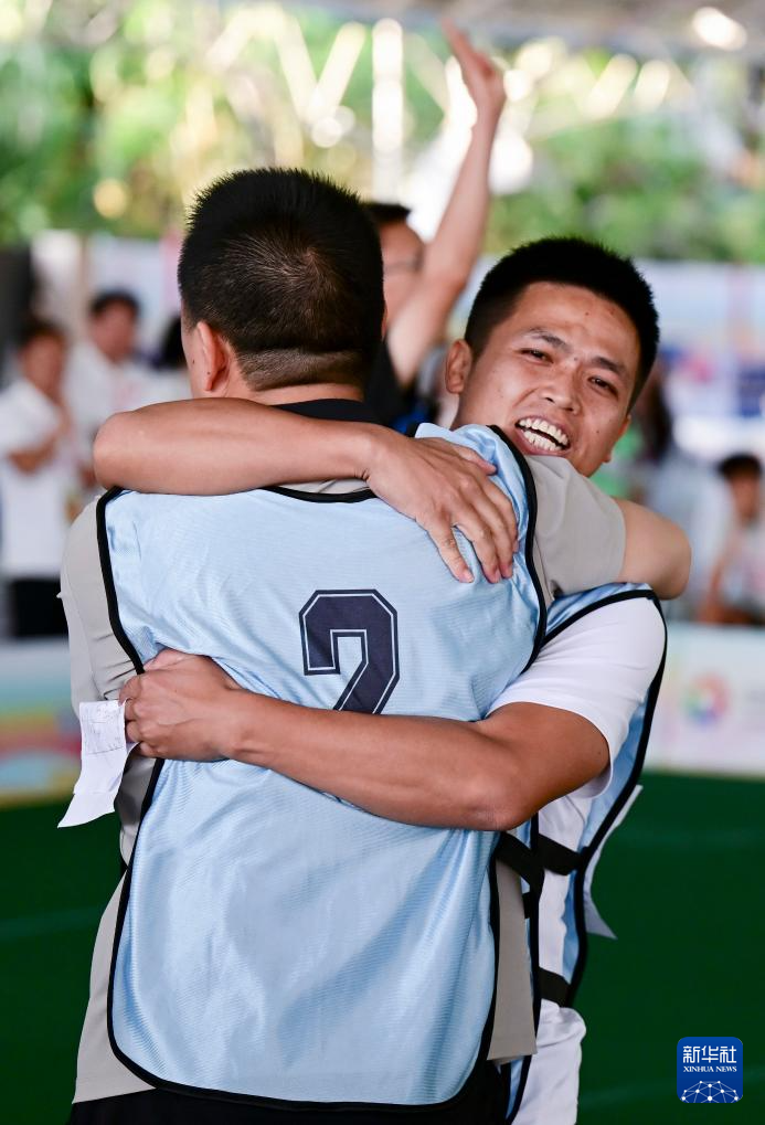 11月29日,贵州队组合胡家卫/胡光吉(左)获得一等奖后拥抱庆祝。