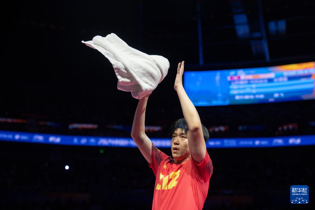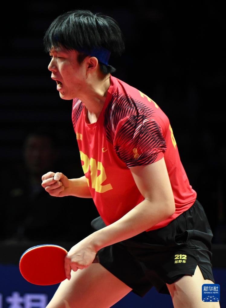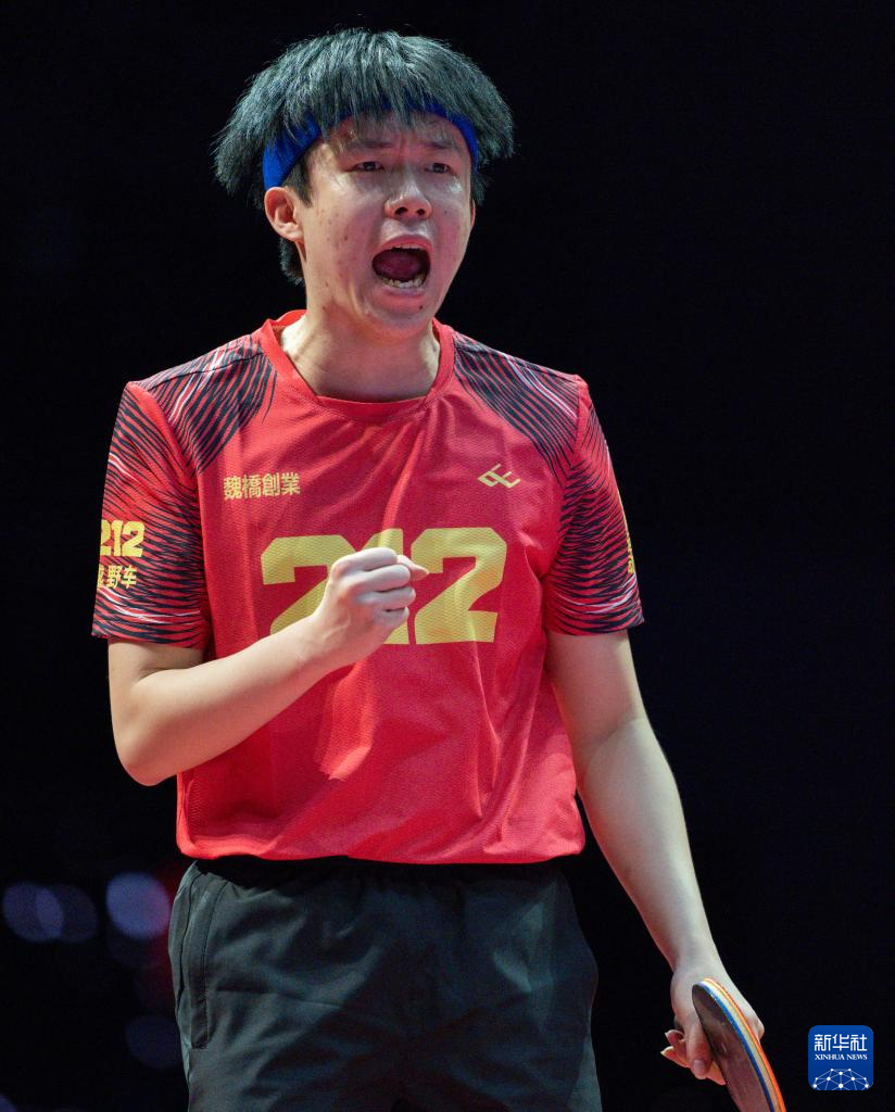 1月1日,山东魏桥·向尚运动队选手王楚钦在单打比赛后庆祝胜利。他3比2战胜黄石基地·华新队选手林诗栋。