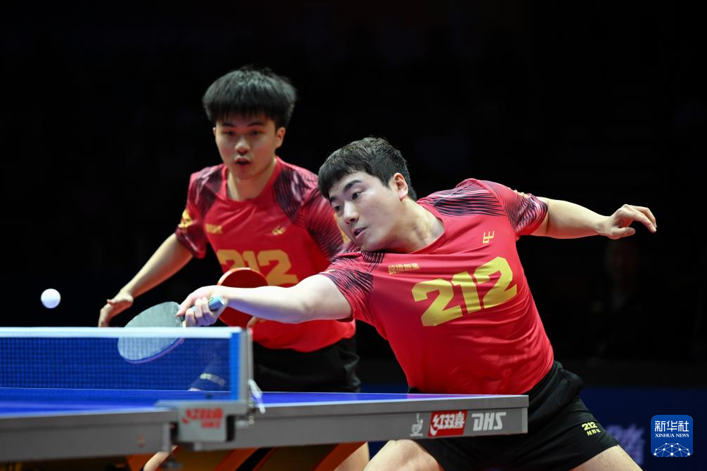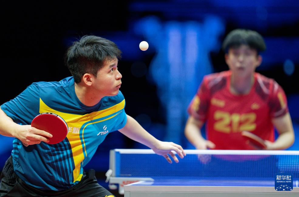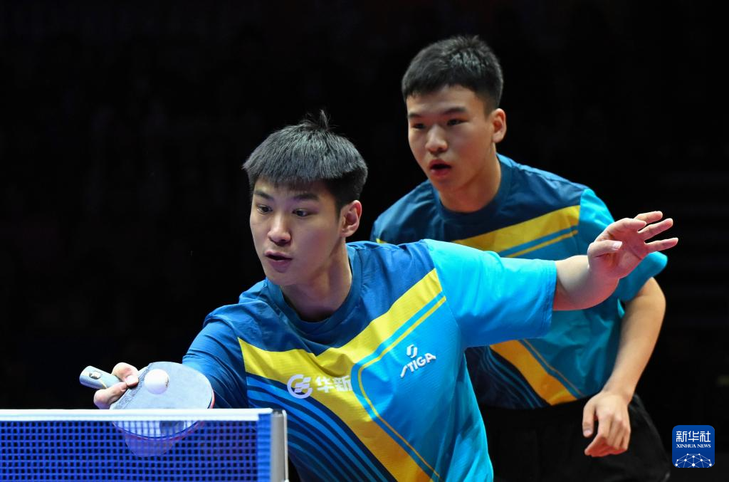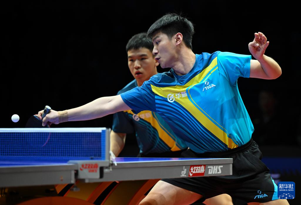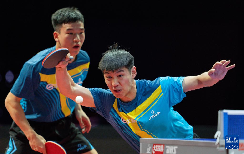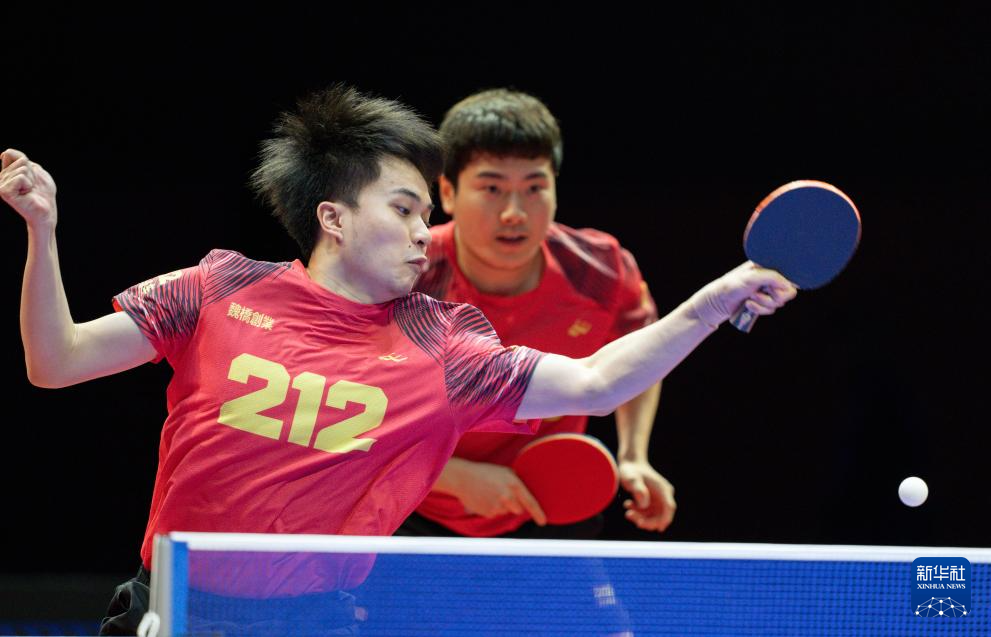 1月1日,山东魏桥·向尚运动队组合林昀儒(左)/梁靖崑在双打比赛中。他们3比2战胜黄石基地·华新队组合向鹏/薛飞。