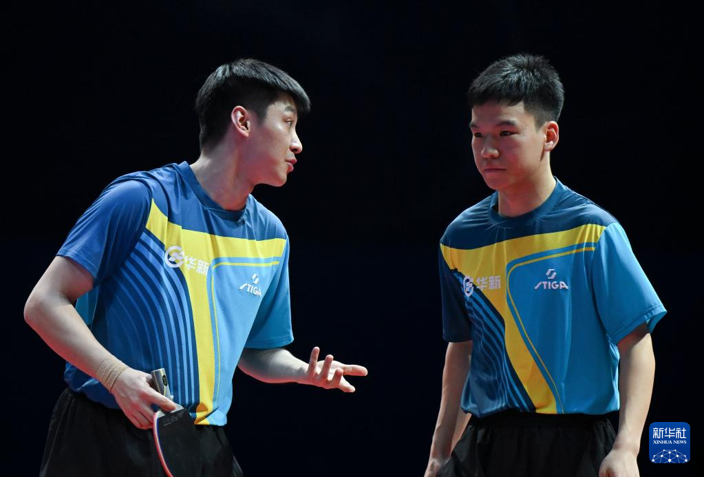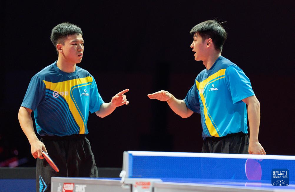 1月1日,山东魏桥·向尚运动队组合林昀儒/梁靖崑(右)在双打比赛中商讨战术。他们3比2战胜黄石基地·华新队组合向鹏/薛飞。