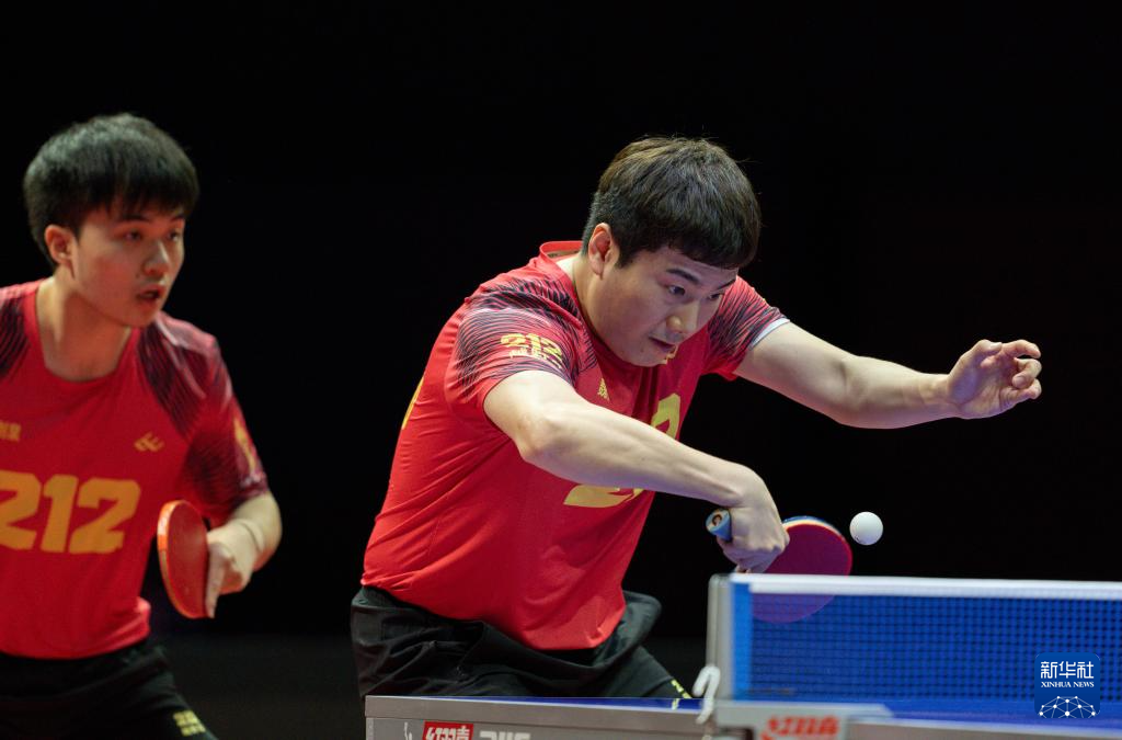 1月1日,山东魏桥·向尚运动队组合林昀儒/梁靖崑(右)在双打比赛中。他们3比2战胜黄石基地·华新队组合向鹏/薛飞。